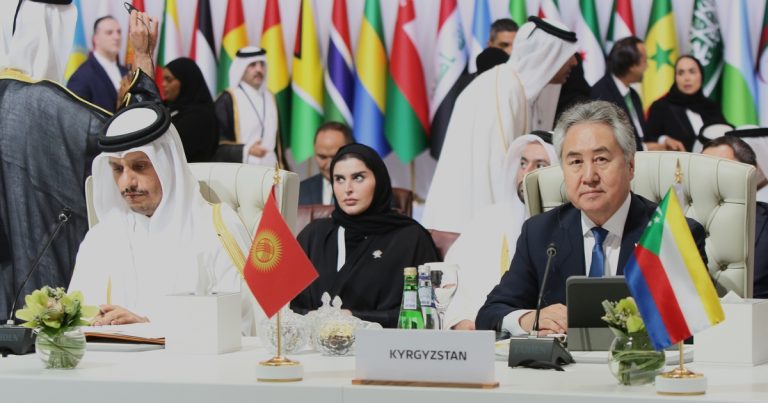 Кыргыз Республикасынын делегациясы Дохада өткөн Ислам Кызматташтык Уюмунун саммитине катышып, президент Садыр Жапаровдун атынан Жээнбек Кулубаев чыгып сүйлөдү. Ал Катарга болгон чабуулдарды айыптап, Кыргызстан Палестинанын өз алдынчалыкка болгон укугун колдой турганын баса белгиледи.